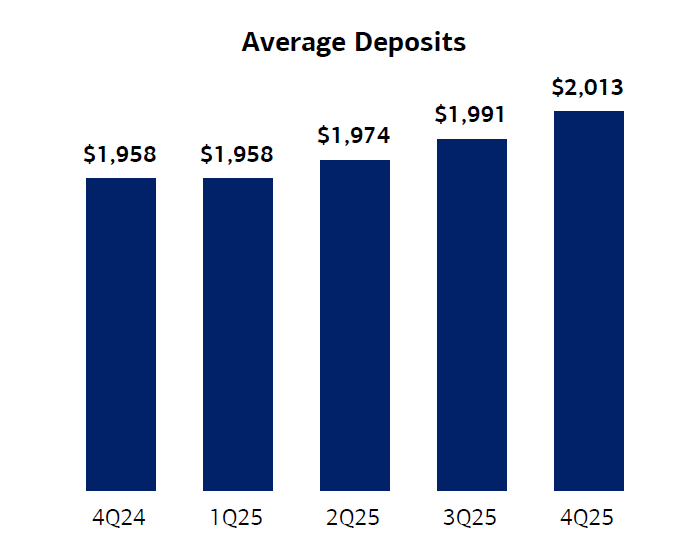 Velikost úvěrového portfolia dosáhla 1,19 bilionu USD při odhadech 1,18 bil. USD. Výše depozit byla 2,02 bil. USD, trh v průměru predikoval 2,03 bil. USD.